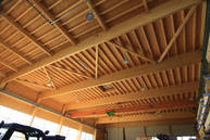 Auf Grundlage dieser Planung wurden alle Stahl- und Holzelemente passgenau vorgefertigt. Soweit dies aus Transportgründen möglich war, erfolgte ihr Zusammenbau bereits im Werk des Brettschichtholzlieferanten. Sämtliche Anschlussdetails waren so konstruiert, dass sich die Bauteile mit wenigen Verbindungsmitteln vor Ort zusammenfügen ließen. Ab Oberkante der Gründung konnte das komplette Tragwerk der Halle deshalb innerhalb einer Woche vom Zimmerer-Bauherrn selbst errichtet werden.